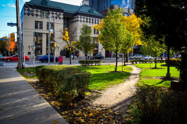 Here’s a corner in Toronto showing the path people are supposed to follow (to the left—staying on the sidewalk up to the corner and then turning) and the path people do follow (to the right). The desire path has literally been worn into existence through being followed so many times.