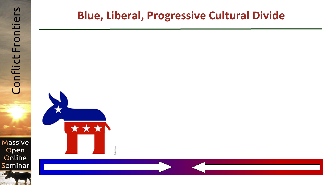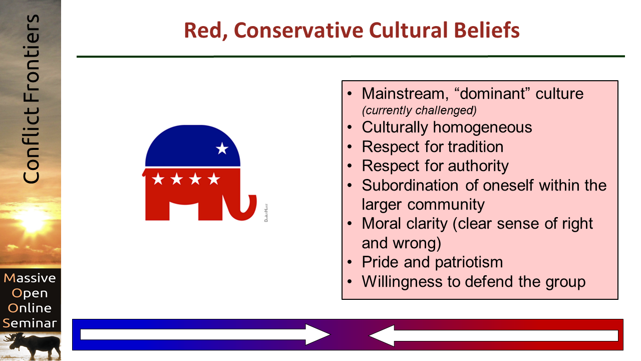 Slide 11. So, to summarize this a bit, the more conservative side of the cultural divide reflects what was (and to a significant degree still is) the mainstream, dominant, Christian, white culture. It's pretty homogenous, there is a respect for tradition, a respect for authority. There is a sense in which people, at least on cultural issues, should subordinate themselves to the traditions of the larger community. There is also a moral clarity and clear image of what's right and wrong, pride and patriotism, and willingness to defend the group. So that's one side of the cultural divide.