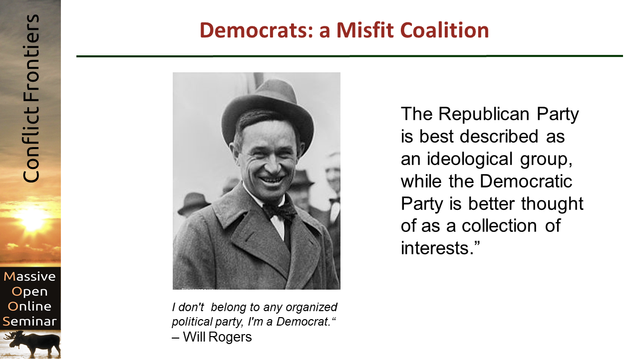 Slide 13. To a very real degree, I think Democrats are a misfit coalition. Will Roger's famous line, "I don't belong to any organized political party, I'm a Democrat" makes a lot of sense. This quote from a recent New York Times article (see the reference section for a citation) also highlights the differences, "The Republican Party can be described as an ideological group, while the Democratic Party is better thought of as a collection of interests." In other words the Democratic Party is a coalition of very different interest groups.