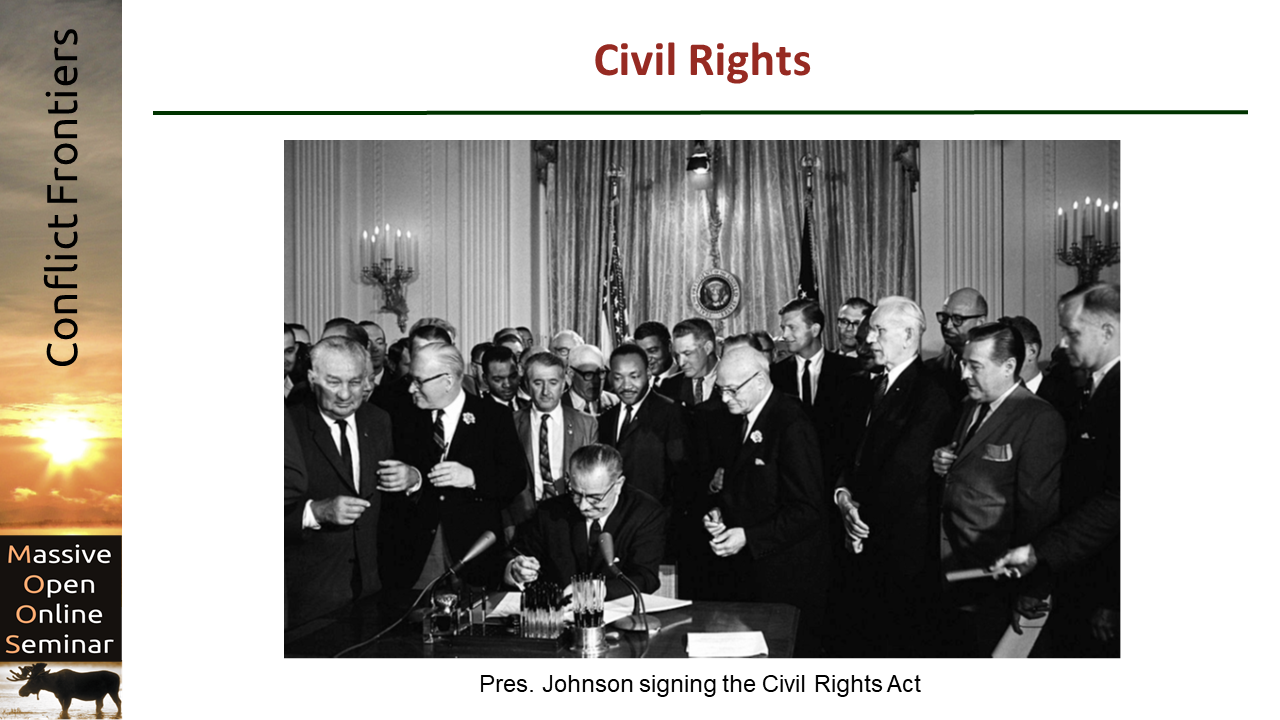 Slide 14. Some of this comes out of the Civil Rights Movement and Johnson's signing of the Civil Rights Act of 1964. With this legislation, the Democratic Party effectively said that they were going to be the champion of those who have been racially discriminated against since the very earliest beginnings of the United States, a monumental step.