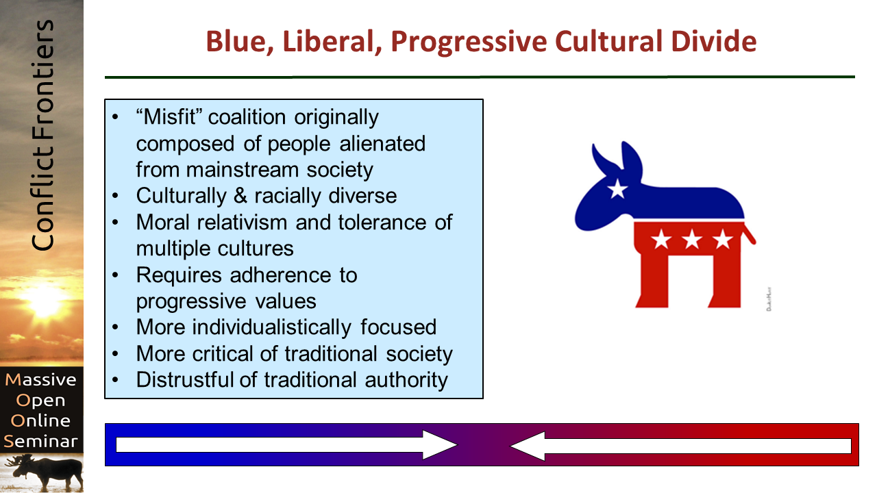 Slide 22. The bottom line is that we have a set of cultural traits on the progressive side that are very much at odds with the traits on the conservative side. This is what you might expect from a misfit coalition of people who have been alienated from mainstream society. It's culturally and racially diverse. It's tolerant of many cultures. It embraces moral relativism. It does, however, embrace a set of progressive values that folks are asked to adhere to. The progressive culture is more individualistically focused, critical of traditional society, and distrustful of authority.