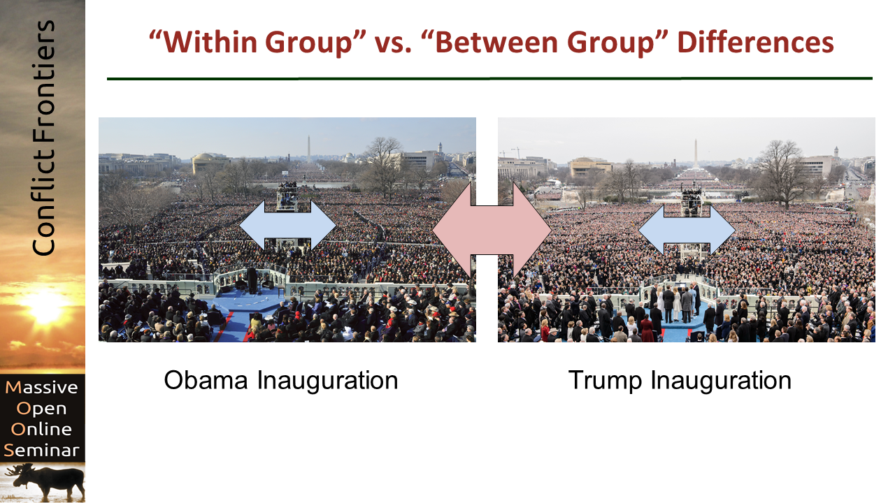 Slide 24. The first thing to keep in mind is that "within group" differences are still very, very large – in many ways larger than the "between group" differences. These are pictures of Obama and Trump's inaugurations. They look pretty much the same. There are just different people in the audience. And there is a lot of variation within both the conservative and progressive coalitions. So, don't get the idea that they're all monolithic and homogenous.