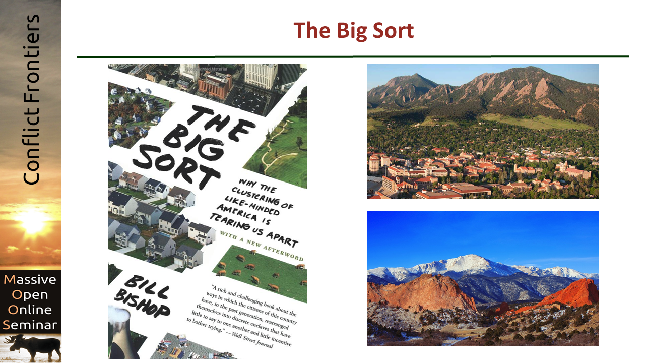 - Slide 25: University of Colorado – Source: https://upload.wikimedia.org/wikipedia/commons/8/8d/University_of_Colorado_at_Boulder_Campus_with_Logo.jpg; By: University Of Colorado at Boulder; Permission: Creative Commons Attribution-Share Alike 3.0 Unported. The Big Sort: Why the Clustering of Like-Minded America is Tearing Us Apart By Bill Bishop. Garden of the Gods, Colorado Springs – Source: https://pixabay.com/en/pikes-peak-mountain-1273566/; By: RescueWarrior; Permission: CC0 Creative Commons