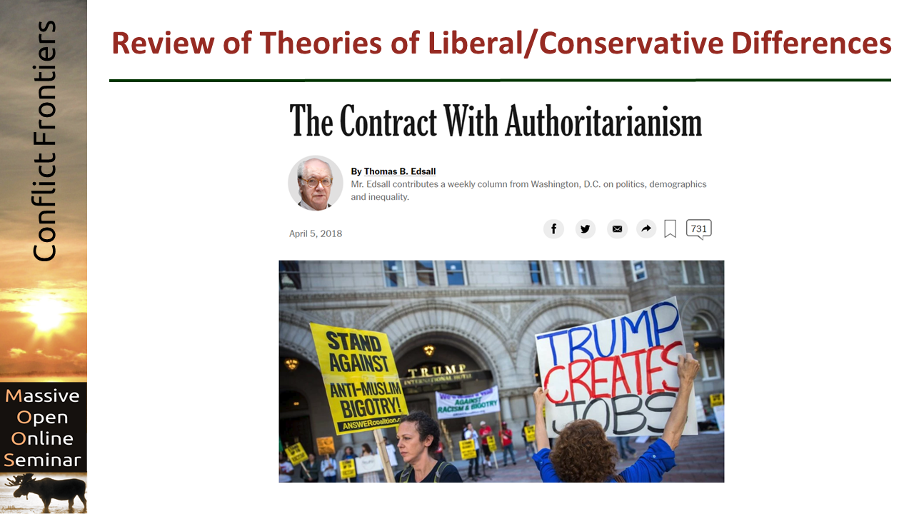 Slide 26. Tom Edsall, in the New York Times, runs a series of articles that are, in a sense, literature reviews that try to help readers understand some of today's big issues. This article "The Contract with Authoritarianism" is an excellent one (though the title is a bit misleading). What he does is review of various theories about the cultural differences between liberals and conservatives. Since he is a liberal, the whole article is a bit tilted toward the liberal side of things. Still, it gives you an excellent window into the nature and causes of these cultural differences.