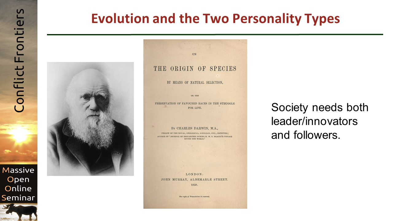 Slide 29. In evolutionary terms, this makes sense. The reason that human societies have been so successful is because people have been able to work together successfully. It is, therefore, not surprising that there are strong biological and cultural incentives for people to "stick with the script" and not deviate too much from traditional norms. Still, to be successful, society needs creative people who are willing to try new things, especially in response to changing conditions. The bottom line is that a society needs both personality types. The question is, what's the proper relationship and balance between them?