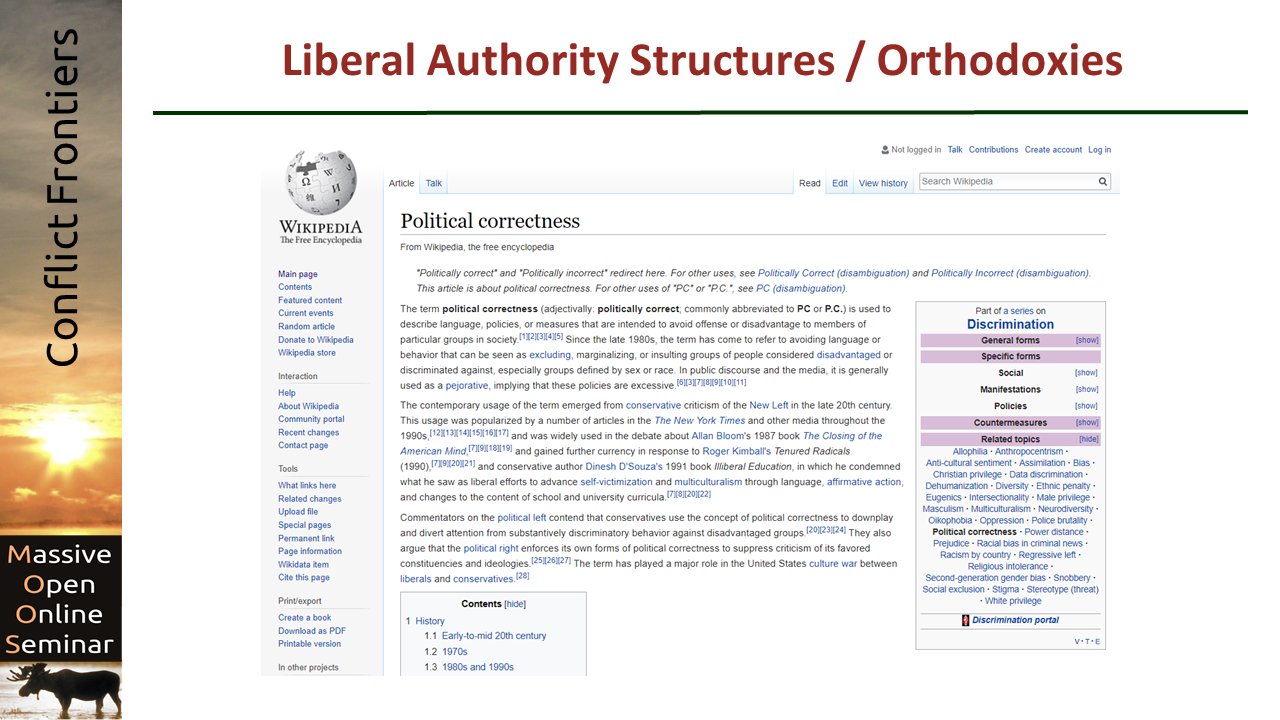 Slide 30. Liberals like to think of themselves as adherents to the creative culture and the "culture of peace" which is tolerant of lots of different views. Still, there is a certain sense in which they, too, abide by strong traditions--it's just that their traditions are a little bit different than Republican traditions. This is reflected in the many ways in which liberal societies discourage deviations from "politically correct" orthodoxies.