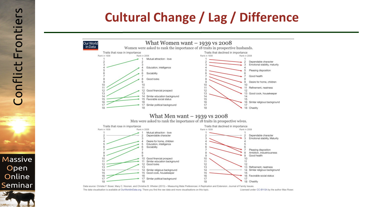 Slide 32. For example, this chart (you can follow the citation to look at the details) shows how "what women want" in men and vice versa has changed from 1939 to 2008. You can see that, over time, there have been huge cultural shifts.