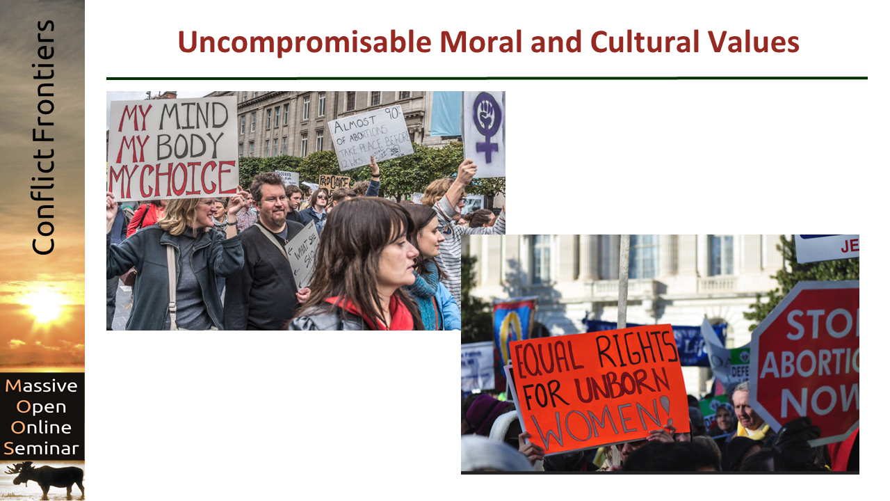 Slide 35. It is also important to recognize that many cultural issues are not really compromisable. These are right-to-life and pro-choice demonstrations. And if you believe abortion amounts to infanticide, it's hard to imagine people compromising and saying that killing some babies is okay, as long as you don't kill others. So, when we think about how best to deal with cultural issues, we have to include strategies for dealing with their non-compromisable character.