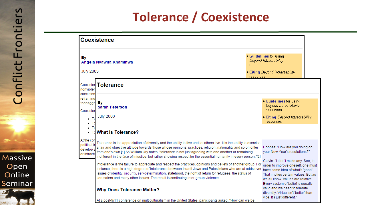 - Slide 36: Angela Nyawira Khaminwa "Coexistence" Beyond Intractability 2003. and Sarah Peterson. "Tolerance" Beyond Intractability 2003