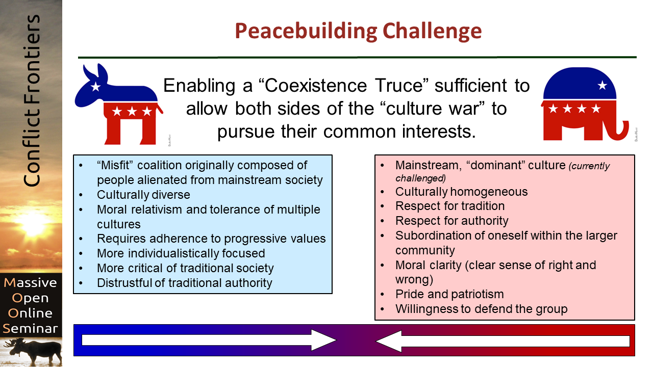 One key to understanding the multifaceted dangers associated with authoritarian populism is to understand the nature of the cultural conflicts that divide liberals and conservatives. This post focuses on how this conflict manifests itself in the United States by looking at the origins and traits associated with the competing cultures. It goes on to consider the argument that these differences have evolutionary, neurobiological origins and that it is unrealistic to expect that they will, somehow, be resolved by either the decisive defeat of one side, or their realization that they were wrong all along. This realization leads to the obvious conclusion that the only viable path toward the social peace needed to resist the authoritarian threat lies in the principles of tolerance, coexistence, mutual respect, and, constructive confrontation (for those cases where intolerable differences exist).