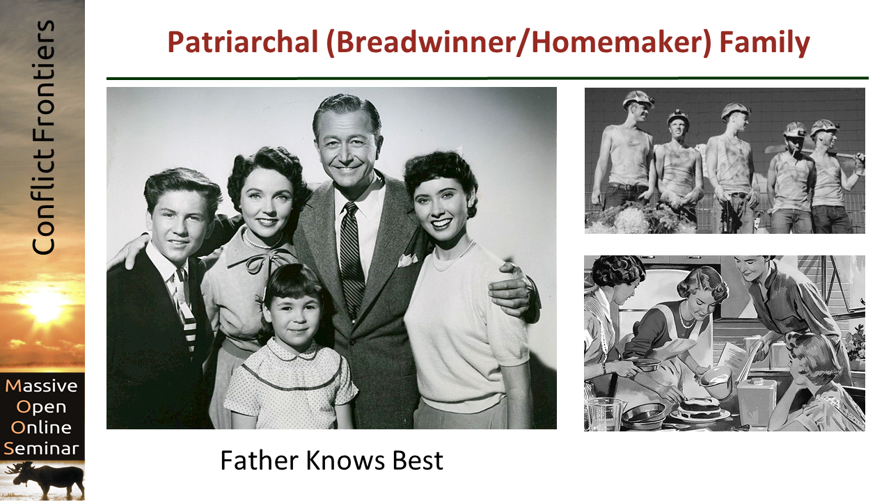 Slide 5. Maybe the best place to start is this notion of a social community built around patriarchal families where you have a breadwinner and a homemaker. This is a cultural view that was dominant in the United States in the 50's and 60's. There were very sharp role differences between men and women. And men would go and work (in construction, coal mines, factories, etc.) and women would stay at home with the kids and be homemakers – which was, to be fair, a bigger job back then (because of all of the labor saving products and services that have become available since).