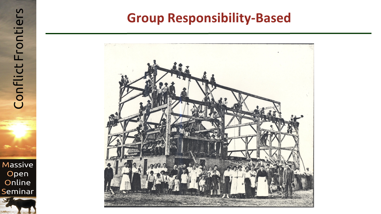 Slide 7. There was a sense in which folks were responsible for helping others in their community. Metaphorically, at least, this is reflected in traditions like a barn raising where everybody comes together to build a barn for somebody in their community.