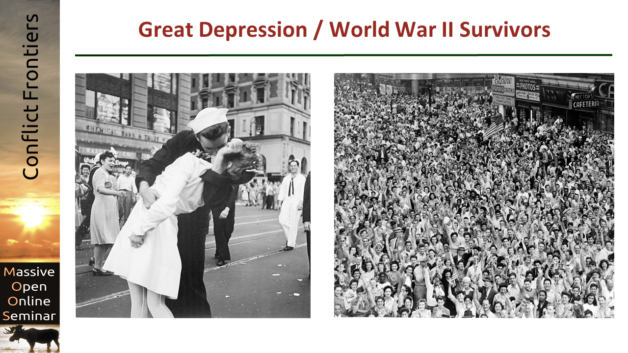Slide 8. This was also a time and a culture that came out of the Great Depression and World War II. My parents had 15 years of their lives torn apart by the War and by the Depression that preceded it. These pictures from VJ (Victory over Japan) Day at the end of the war reflect the sense of everybody wanted to be done with all the turmoil. They wanted to get married, settle down, have kids (the baby boomers). They got through the war by sticking together and respecting authority and they were inclined to continue to do that.