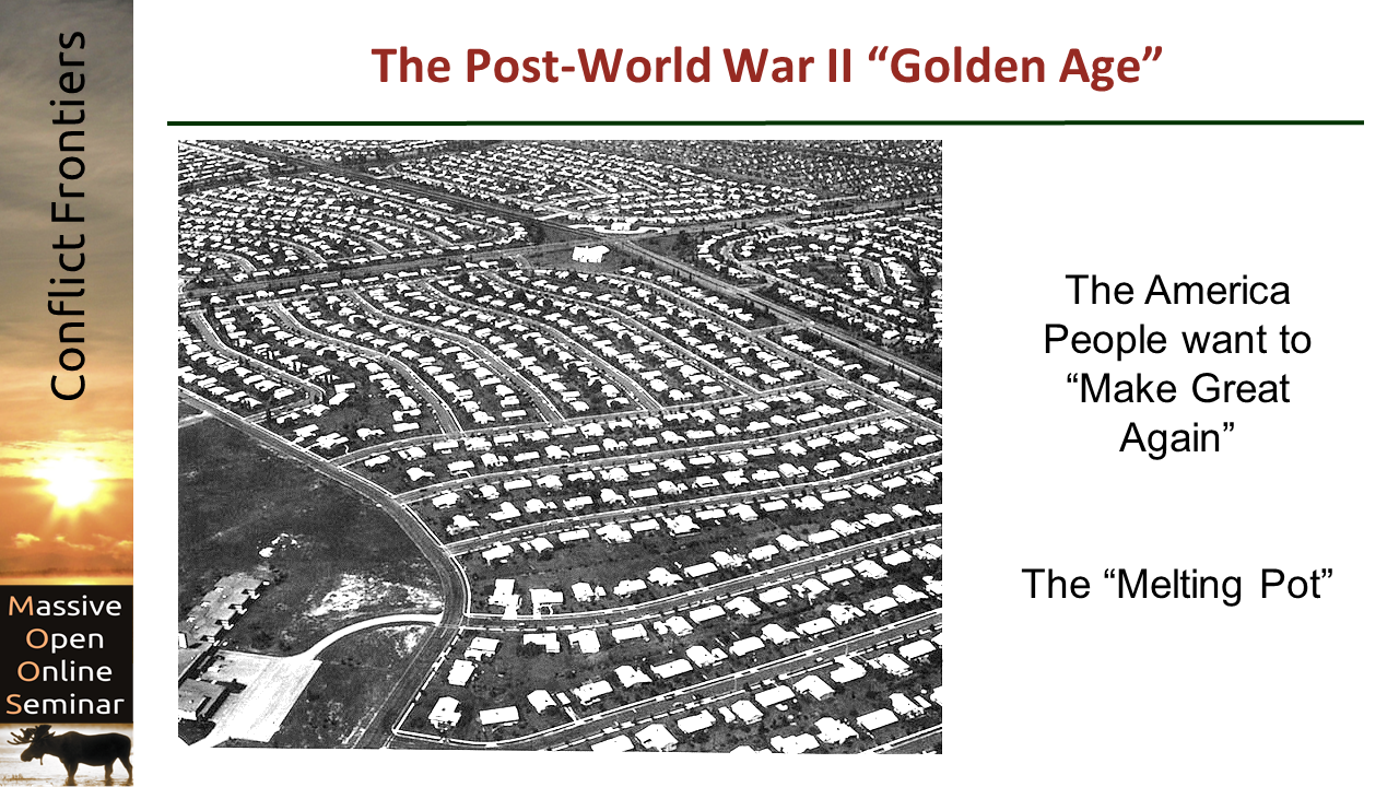 Slide 9. This led to the rise of suburbia. It was, in many ways, the economic Golden Age. We built the interstate highway system, we built houses, there were jobs for everybody, and the level of social equity was much greater (the proportion of the society's wealth that went to the very rich was much less). In some sense, I think, that this is what people who say they want to make America great again, want to go back to.
